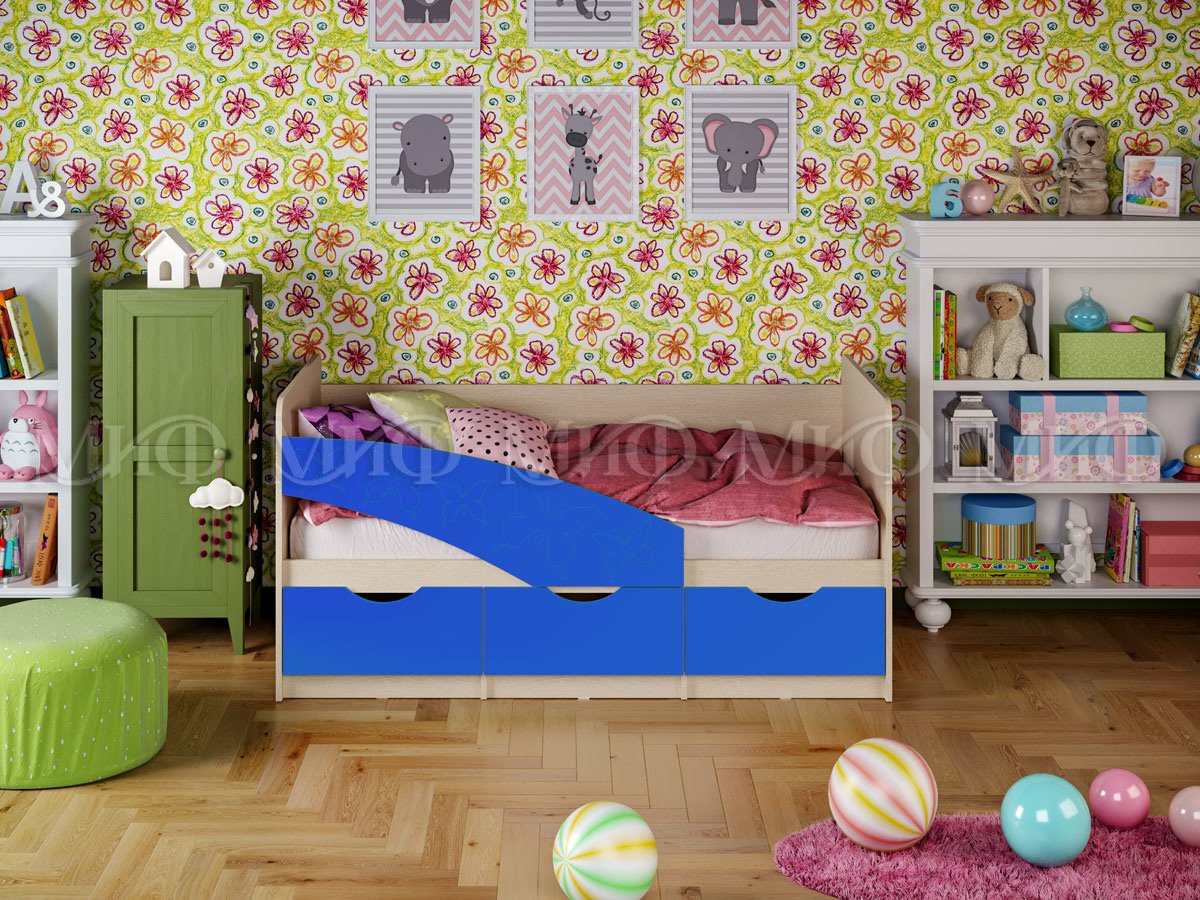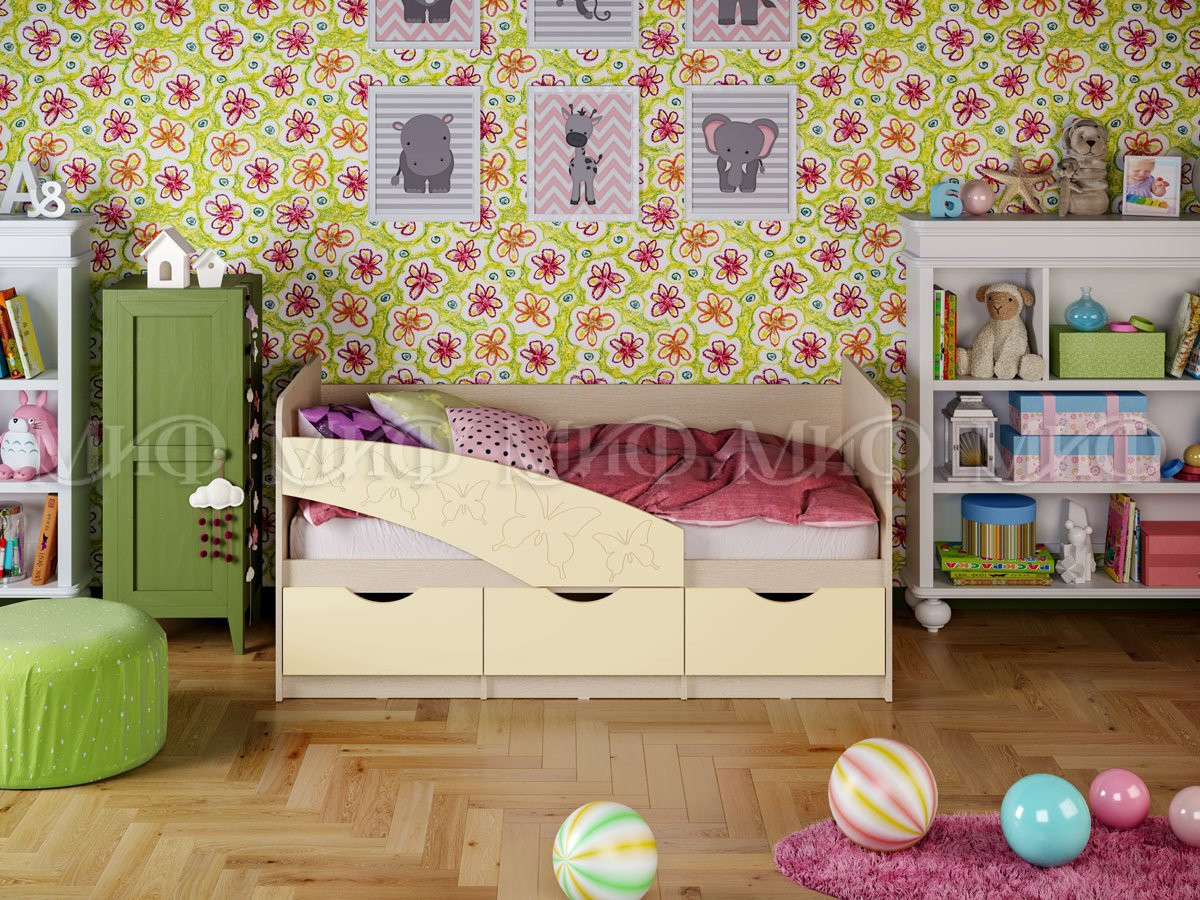 Кровать Бабочки  безопасна для ребенка младшего возраста за счет скругленного бортика с рисунком Бабочки. Под спальным местом находиться центральный выдвижной ящик и две боковые ниши с откидными дверцами, добавляющие кровати функциональности. Исполняется в широкой цветовой гамме, что позволит легко выбрать Вам нужную по цвету.